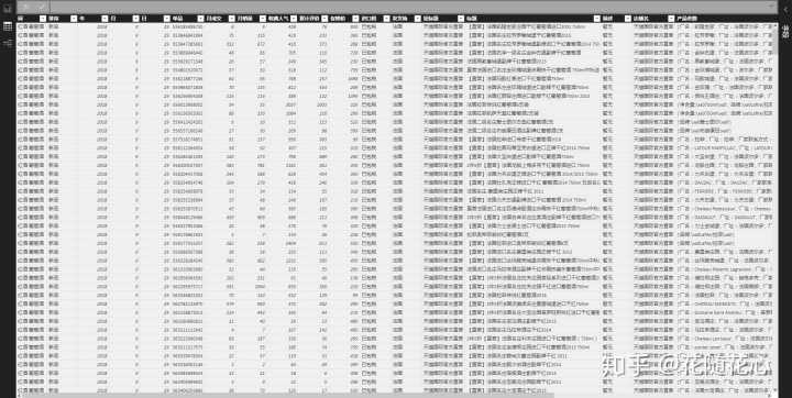然而,我今天用的是却是搜索数据,这是天猫国际上关键词[红酒 干红]的数据,并且是新品排序。也就是说,这些产品都是新品。 什么是新品,我应该不用解释了吧。我今天的目的只有一个,通过多个关键词的数据,来分析出红酒类目当中,究竟什么样的新品是属于天猫国际的官方直营店的。 于是乎,我用PBI将数据源进行处理之后,得到下面的数据表,如图所示