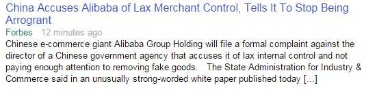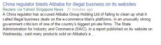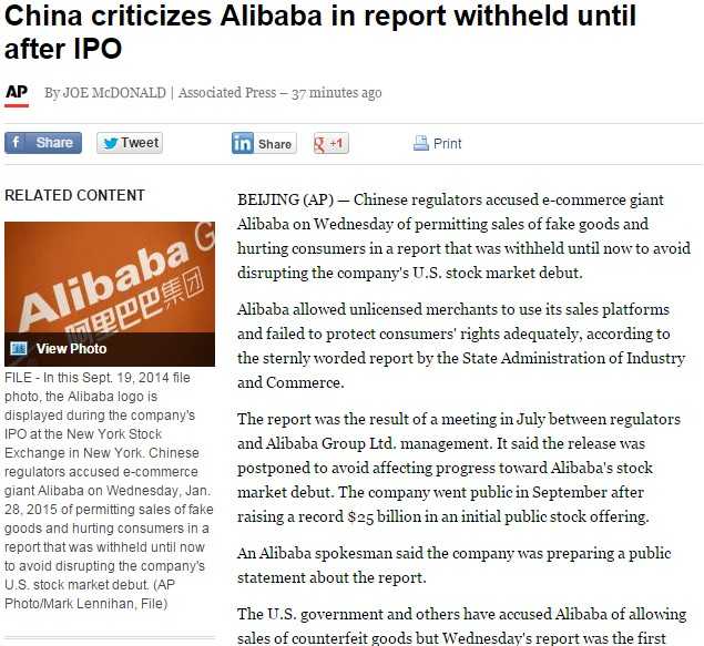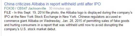 ↑首先是美联社《China criticizes Alibaba in report withheld until after IPO》,标题把新闻点放在“中方扣留了涉及阿里巴巴的假货报告(即白皮书),直到它在美国IPO成功后才公开”。