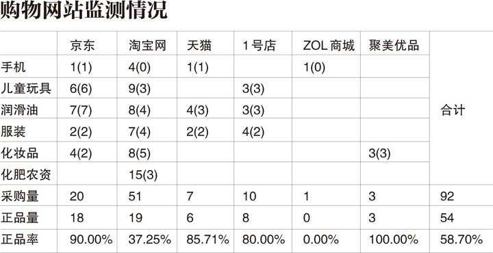 2014年8月-10月的一项抽查显示:92批次网购物品中,只有54批次是正品(authentic),正品率仅58.7%。其中,淘宝购买的51批次商品仅有19批次是正品;天猫购买的7批次商品有6批次、京东购买的20批次商品有18批次、一号店购买的10批次商品有8批次、ZOL商城购买的1批次商品有0批次、聚美优品购买的3批次商品有3批次,被证明是正品(proved genuine)。(编者注:来自国家工商总局2015年1月23日发布的2014年下半年网络交易商品定向监测结果)