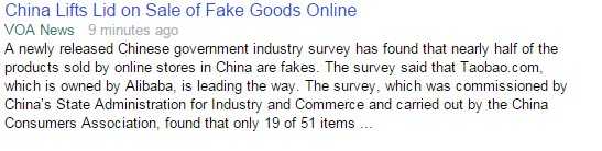 ↑亚洲新闻网络转载《中国日报》的报道《中国每两件网售商品就有一件是假货》,文章提到了这次阿里巴巴PK国家工商总局的导火索:
