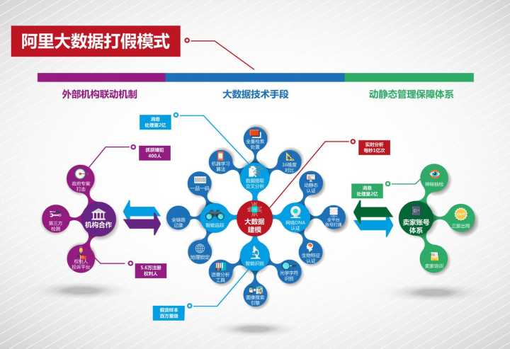 【阿里巴巴在十五年和不法分子的斗争中,逐渐打磨出一套自成体系的打假模式,其中最核心的部分是大数据打假。简言之,通过智能图像识别、评论、留言、投诉等数据抓取与交叉分析、智能追踪、大数据建模系统等技术,将假货从10亿量级的在线商品中捞取出来。