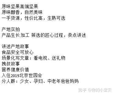 首先,我找关键词:进口、原味、健康、高端坚果。罗列了一些有价值的内容: