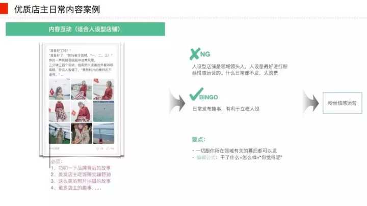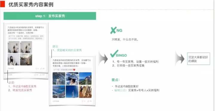 口碑沉淀:售后内容。包括买家秀、优质的售后服务。比较好的一个案例就是有店铺已经在做一些会员日、“粉丝回访”这样的动作。