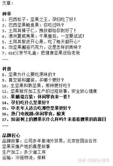 3、sku虽少,但是每一种产品都需要讲故事(我以前在母婴企业做过企划,奶粉要写很多软文,坚果其实也是,我们需要:单品软文+企业匠心软文+安全角度的软文+产地软文+加工生产过程软文+安全软文+冷链运输+农户合作+食用方法+食用场景……等等,太多了。