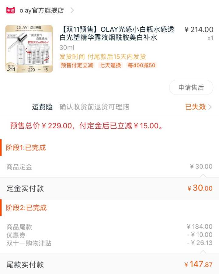 2.Olay小白瓶,优惠:199-100的券+津贴