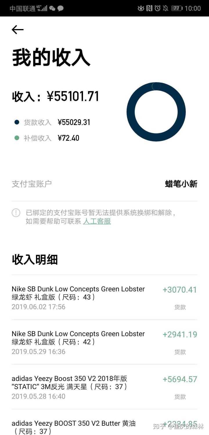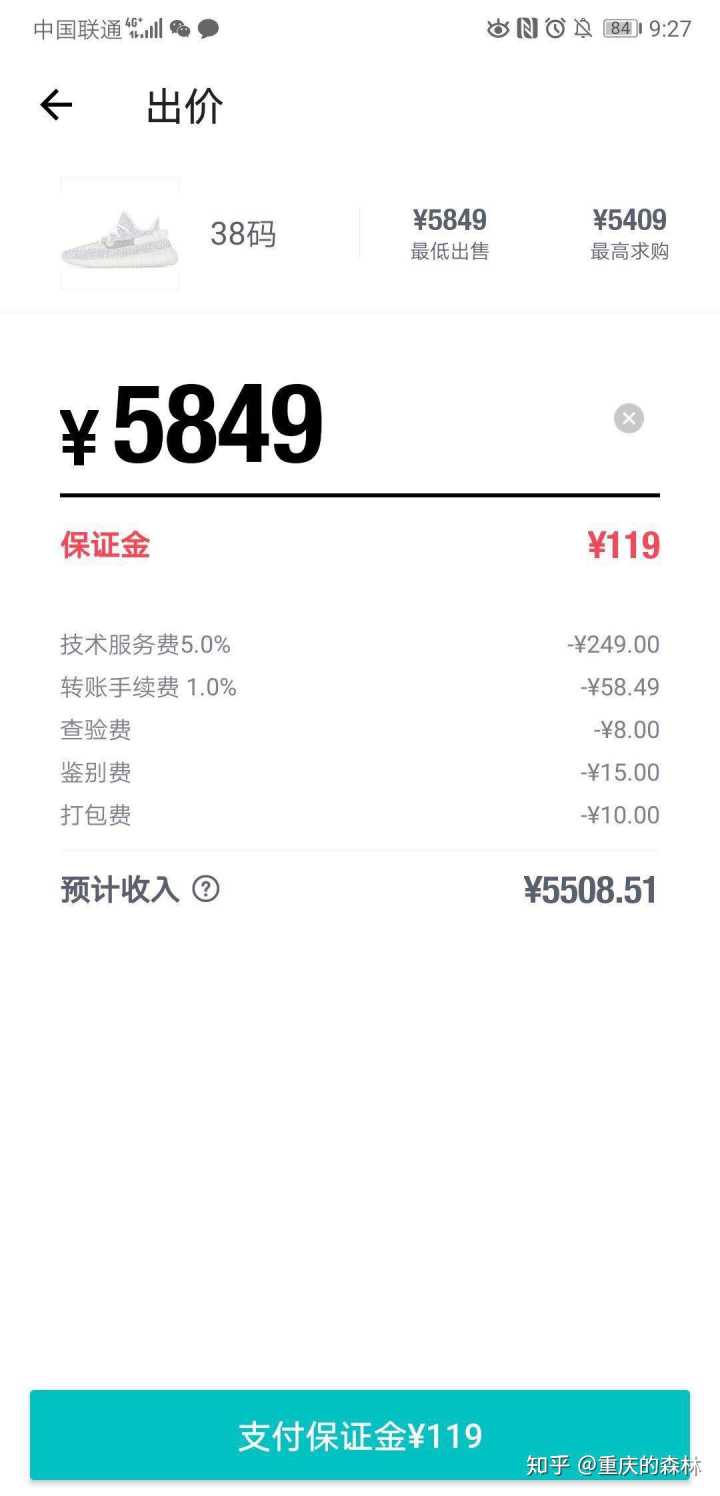 图上是在毒App平台出售这款鞋子38码的价格 5849 扣掉各项手续费到手5508 利润是2291元!!!资金压了仅仅五个月的时间利润率却高达71% 可以说是相当暴利了