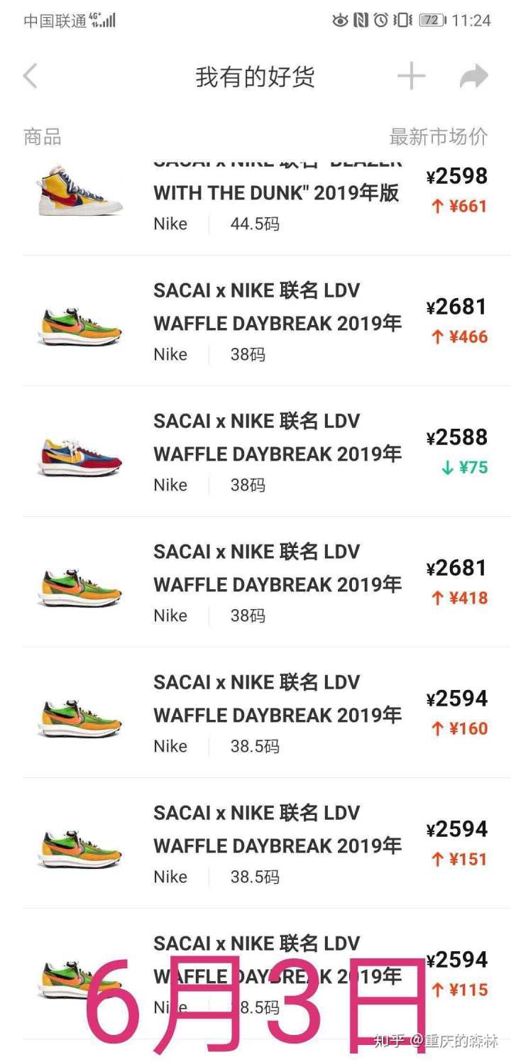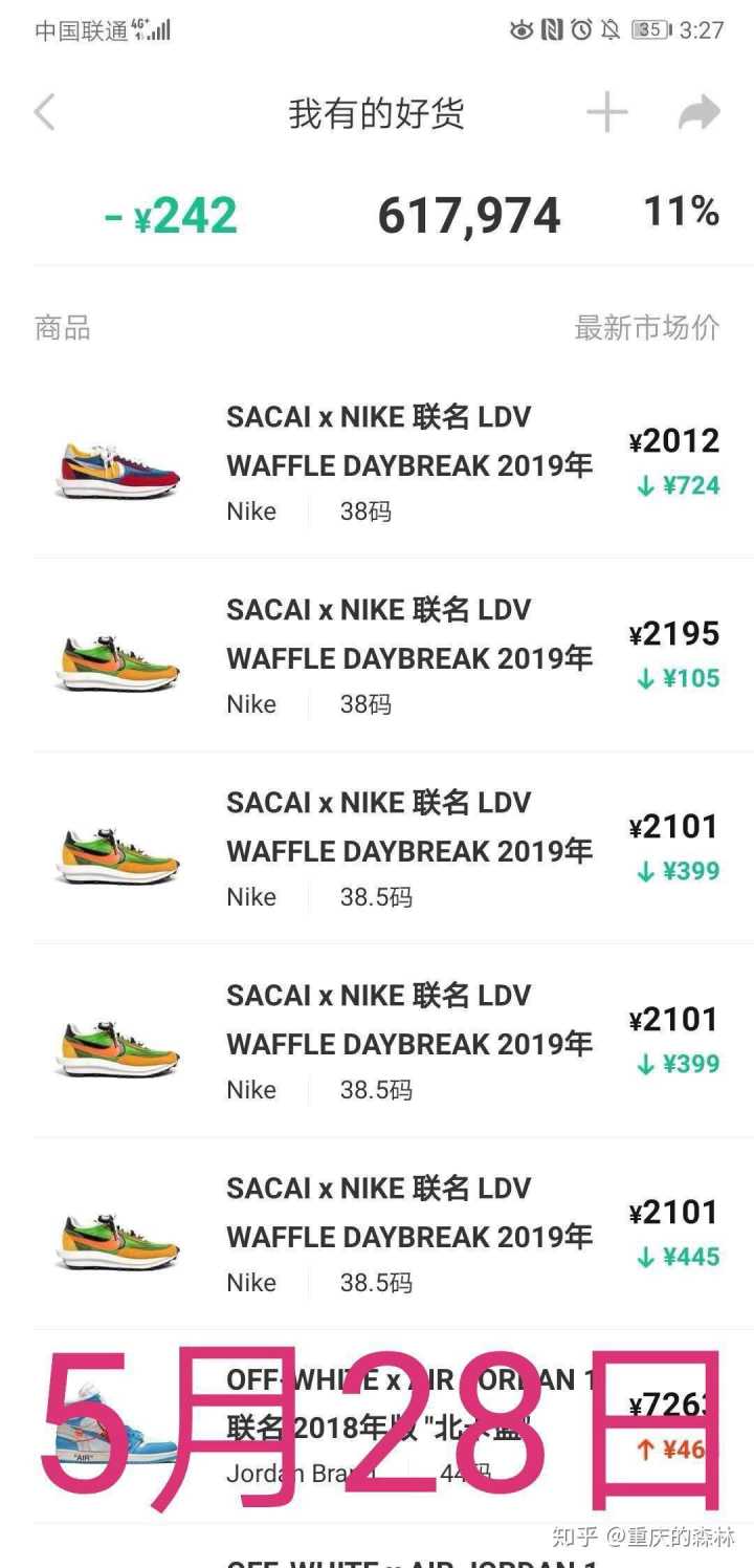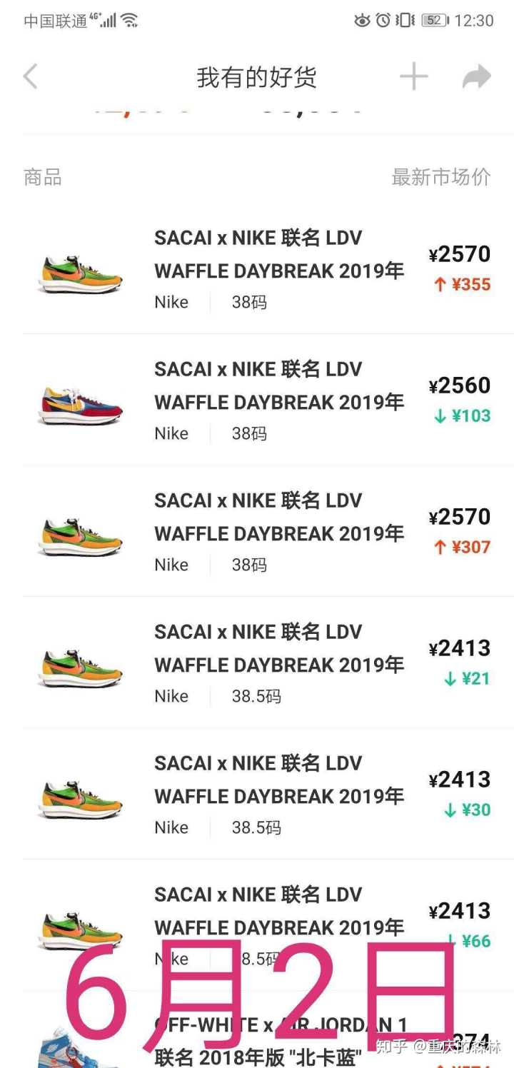 不同于上面从美国购买鞋子的方式 我是从Nice平台购买的国内现货 优点就是周期快 资金压力小 这个方法适合一些当前热度高但是热度下降比较快的鞋款 我购买这款鞋子的时间是5月24日 这款鞋子发售的前一天 一共购买了4双 没想到发售后价格一路暴跌 但是凭借我卖鞋3年来的眼光和经验 我并没有着急出手 而是趁着低价默默的又买了两双 后面几天的价格说明了一切 原本要亏400块的鞋子现在还能倒赚100多