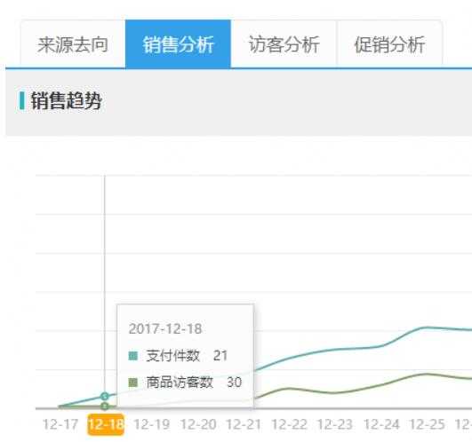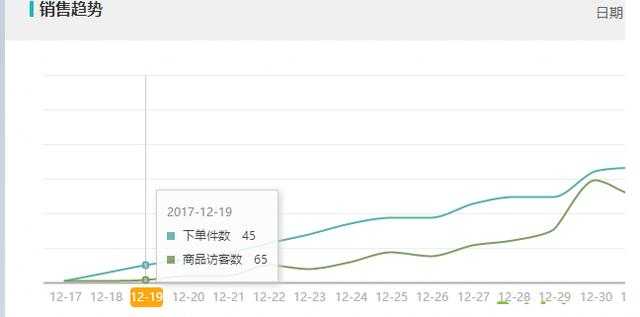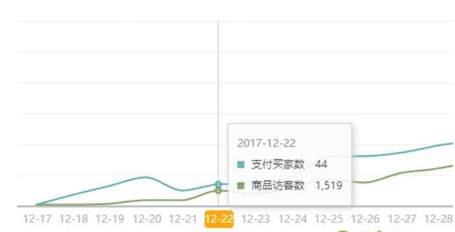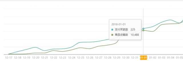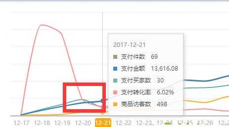 我们通过这张图,可以看到明显的交叉发生在12月20日和21日之间。12月21日的转化率维持到了6.02%,达到行业优秀转化率的2倍。聪明的朋友可能已经发现了这一天做到这样的数据的窍门。这里的支付件数的线和支付金额的线是重合在一起的,因此,我们看的时候,会感觉是4条线,但是到后续两条线会逐渐分开。这也是这个玩法的重点之一。