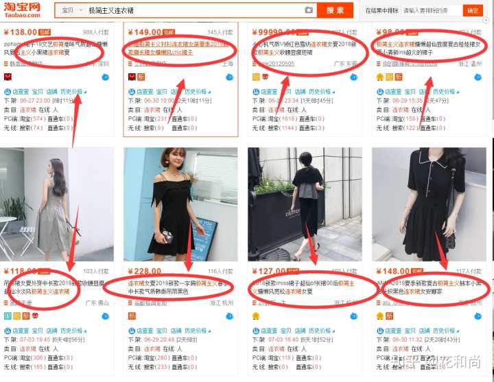 这种关键词就代表了有很大的市场需求,而如果你的标题中没有这个词,那么买家搜索这个“极简主义连衣裙”的时候淘宝就不会把你的产品展示给买家,如下图