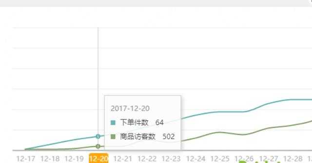 黄色:商品访客数的线条始终随着支付件数和支付金额的提高,保持平行的状态快速增长。