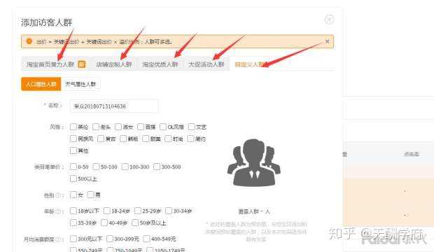 建议参考生意参谋里的流量-访客分布-访客分析来设置地域与人群,如下图: