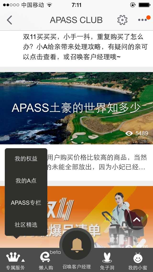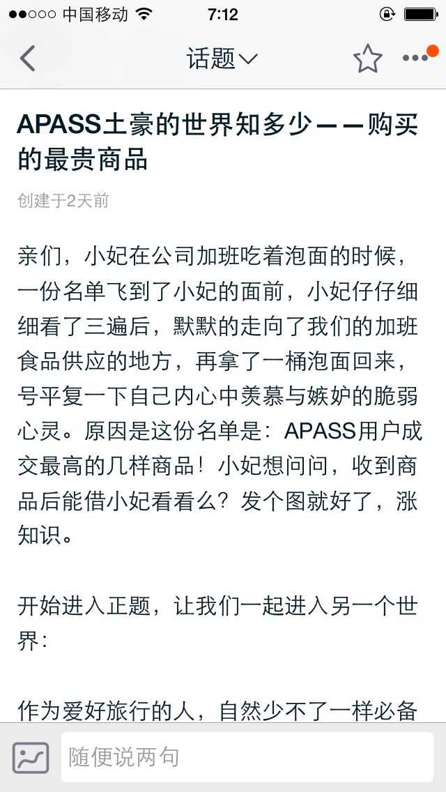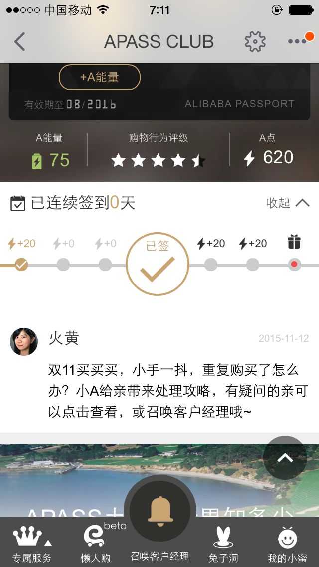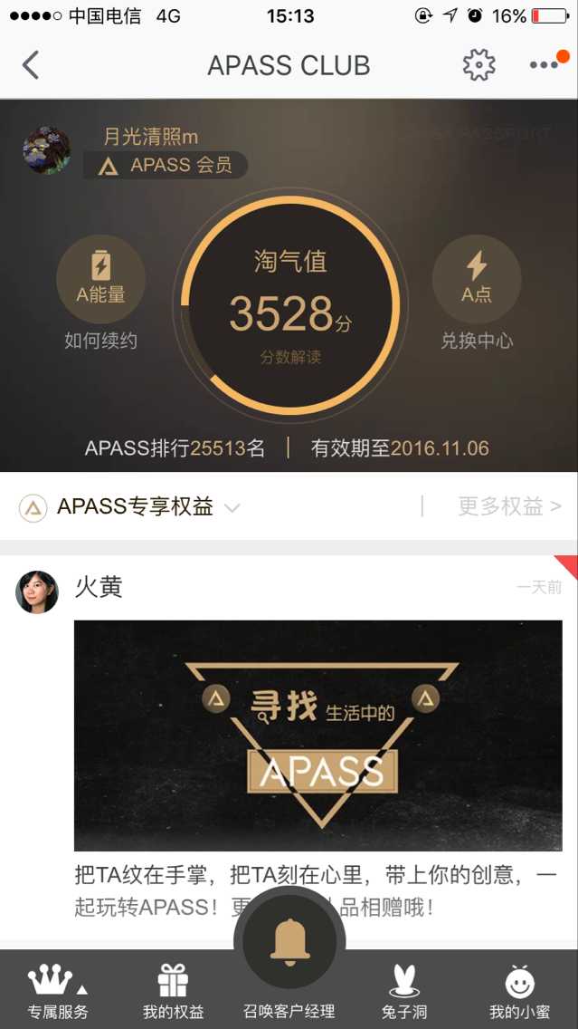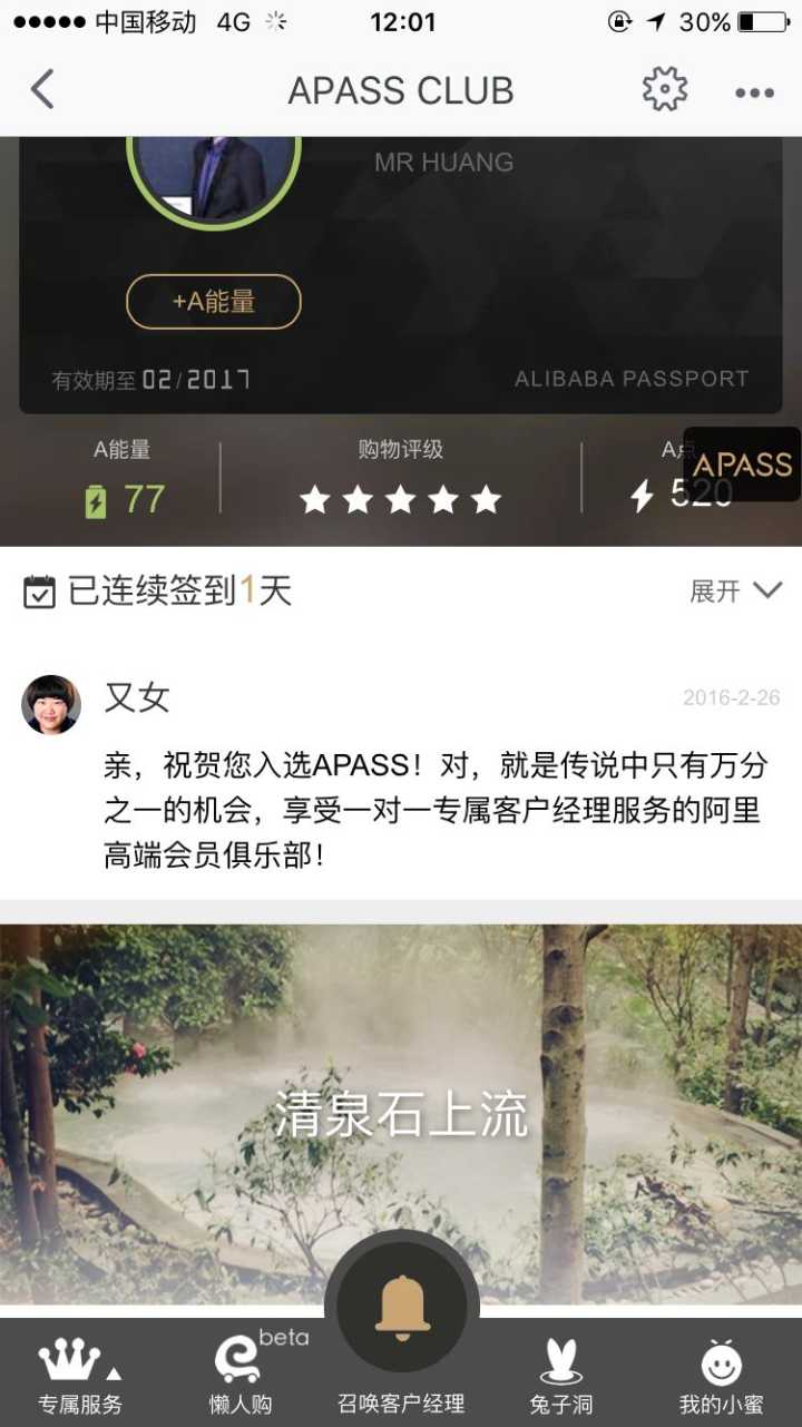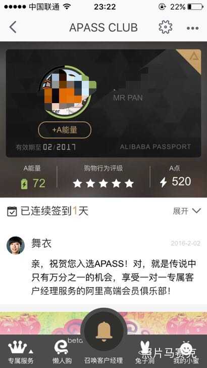 昨天听小伙伴说了一件棒呆了的事儿。 小伙伴男朋友是淘宝的APASS会员,具体的权益没说很多,具体说来已知她告诉我的就是:每天送一张退货卡;有专属客户经理,在手淘上可以随时“一键召唤”,马上就会有人打电话来;在旺旺聊天的时候如果提到任何可能会涉及资金安全的事情时,也马上会有人打电话来提醒你,等等。 搜了一下,应该是今年四月份的时候淘宝新推出了这个类似于白金会员的APASS,但网上资料很少,也没有公布具体的资格…