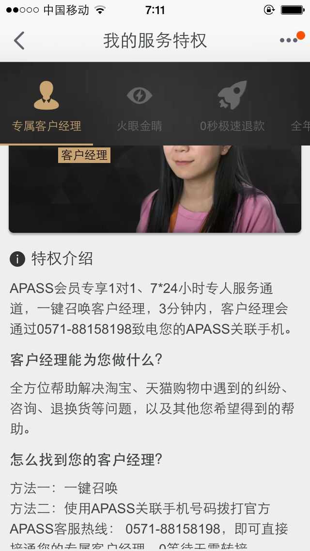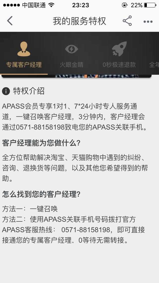 APASS 全称为 Alibaba Passport,即每位会员都拥有一位专属客户经理。我们在官网上看到,除了专属客户经理外,会员还享有以下权限: 365 张退货保障卡, 24 小时电话、短信提醒, 5000 元极速退款的额度。