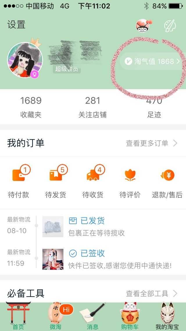 淘宝有一个数据叫做“淘气值”。打开“我的淘宝”页面,右上角就可以看自己的淘气值: