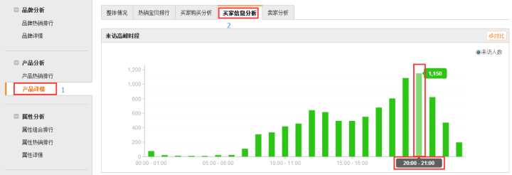 使用工具:数据魔方-产品详情-买家信息分析-来访高峰时段。