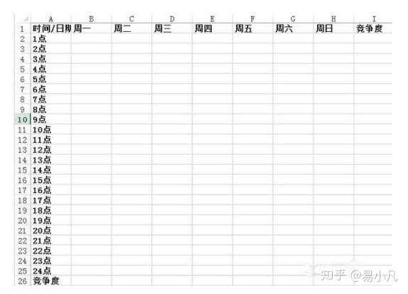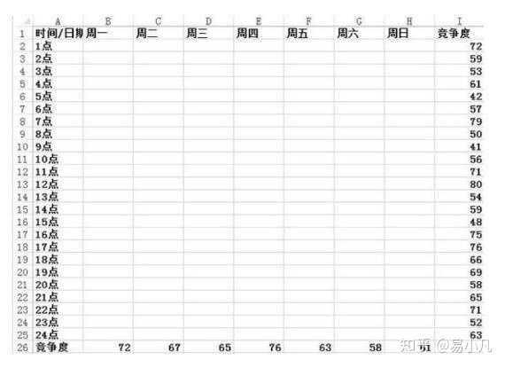 这时候大家在表格中找到每天竞争度最低的时间段,将其标红,然后通过这种方式大家就可以很容易找出低竞争度的TOP5或者更多的排名。这些时间段都是在自己类目下非常优质的时间段。最后大家就可以依次把自己店铺的宝贝安排在相应的时间段中。