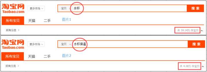 (1)淘宝网搜索热门关键词“水杯”,淘宝展示出来的宝贝共有59.14万件(如图1),因此在自然搜索豆腐块中展现的宝贝,就是从59.14万件宝贝中挑选出的4000多个。59.14万