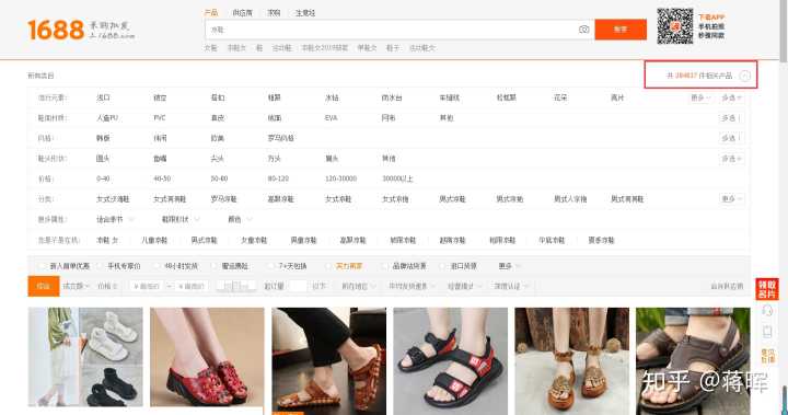 就以阿里巴巴的一件代发为例,在阿里巴巴搜索框中搜索产品关键词后,会出现很多的产品选择,以“凉鞋”为例,会出现几十万的产品供选择。