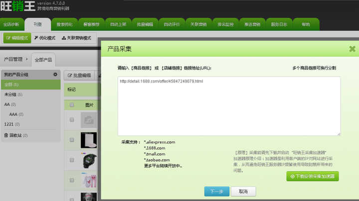 3. 现在很多卖家做跨境电商,但是要如何解决快速复制淘宝天猫店铺大批量的搬家到全球速卖通的难题呢?其实你可用一款第三方软件来帮你排忧解难,旺销王!智能与便捷结合于一体的软件,帮你快速复制淘宝天猫店铺大批量搬家到全球速卖通,让烦恼统统走开!打开旺销王的刊登功能,刊登功能里面采集诊断刊登,三样法宝!http://www.wxwgood.com/?f=8