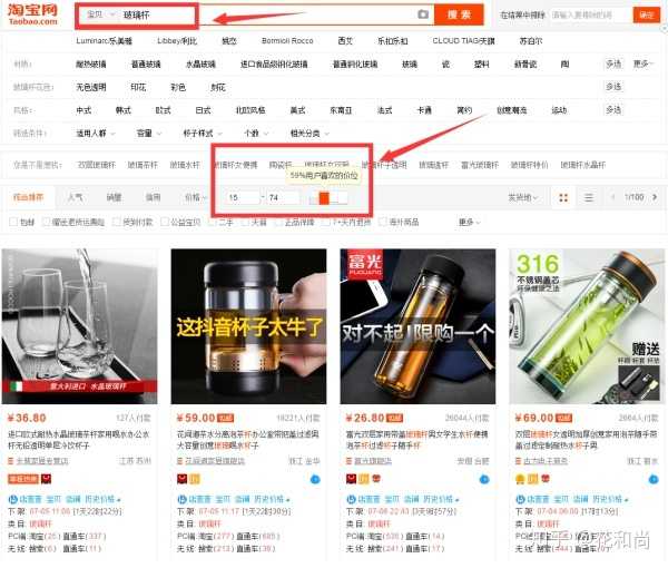 比如我们在淘宝首页搜索“玻璃杯”的时候,可以看到一个价格区间