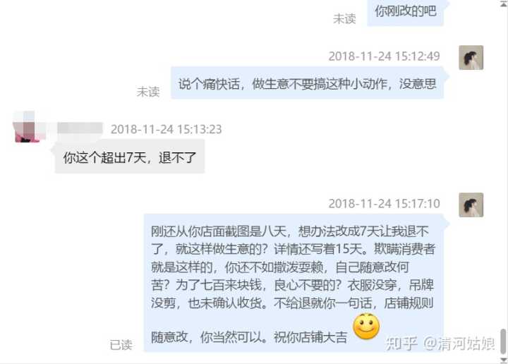 后面就是商家的骚操作了,我点了退货退款后,客服要我把退款理由改成七天无理由退换,我拒绝了,两边谈话不了了之。一周过去,对方没有任何回复,我上淘宝退款页一看,发现不知道什么时候对方同意了退款,但是在退款页面上再一次强调七天无理由退换。