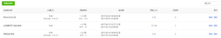 后台主要就是一个优惠券的列表和新建优惠券的功能,主要提供优惠券查看,新增,编辑等功能