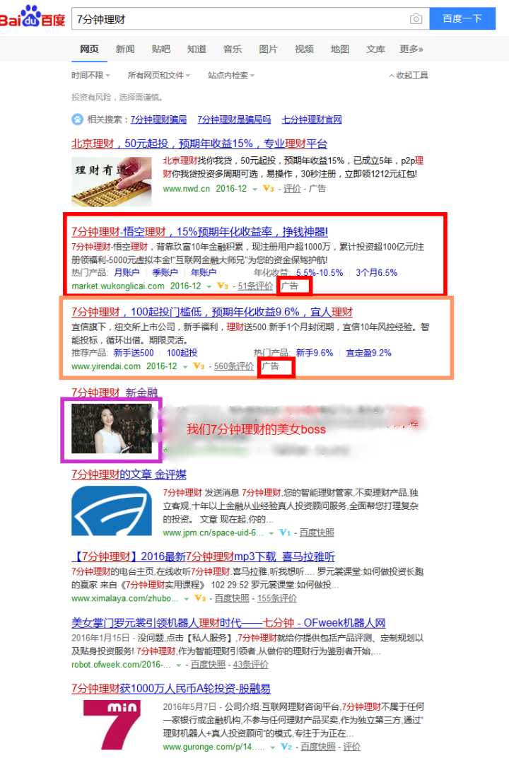 你看,我们公司7分钟理财也被一些不良的P2P平台拿来做推广词,你看百度多恶心。被不明的吃瓜群众点进去,被百度忽悠、诈骗妥妥的。
