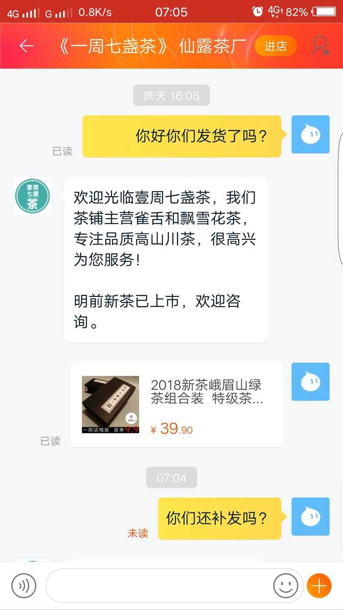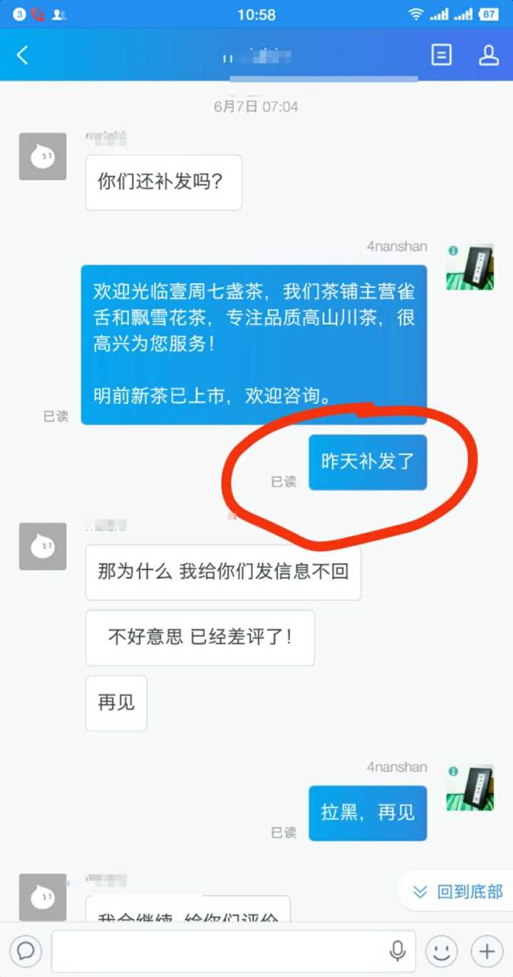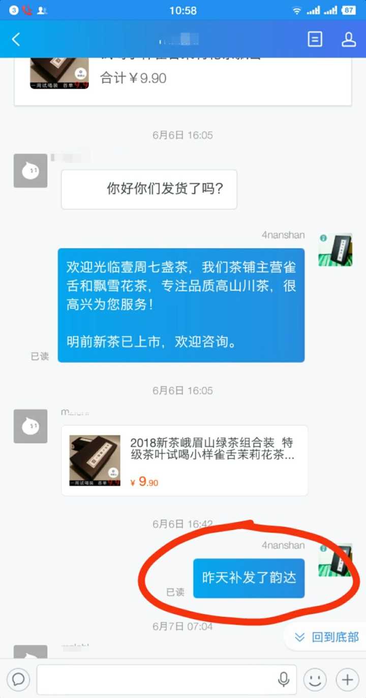 第三天一大早七点零几分在旺旺上问我,今天还补发嘛?当时我还没起床,听见叮咚就赶紧拿手机,感觉就有点懵,明明昨天就回复已经补发了,为毛今早又在问?