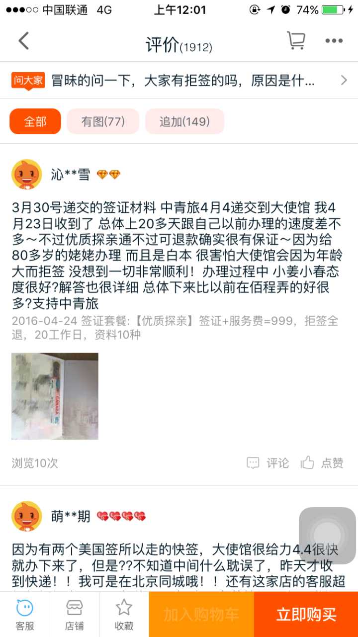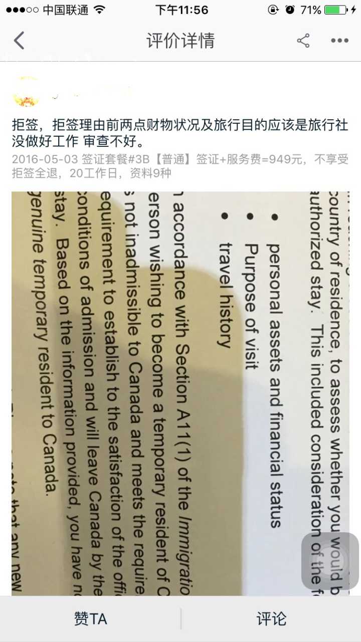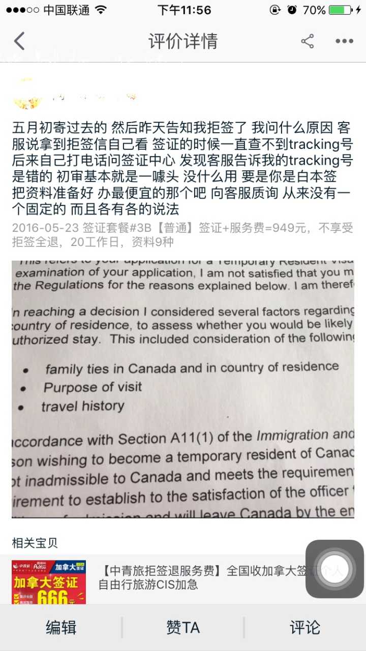 真实的事情 前几天在某宝上的中某旅办加拿大签证 由于是白本 很慎重 然后找了一家好评高的 办签证的过程就省略了 结果是拒签 在办理和拒签中卖家的态度很不好 所以给了一个差评 然后就发生了一下的事情