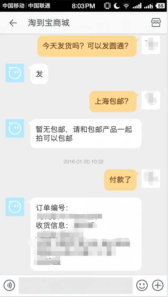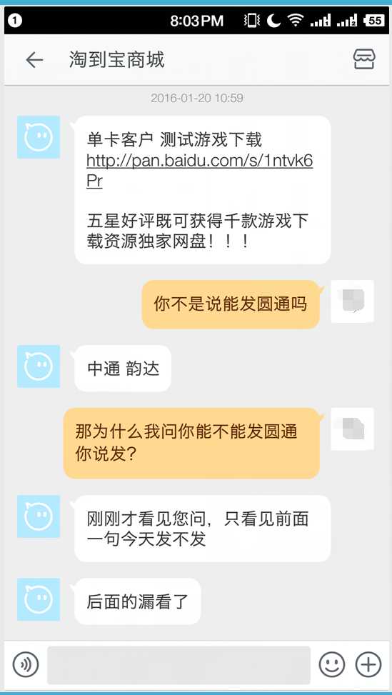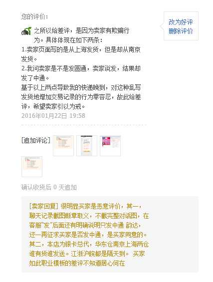接着往下看,在我质问卖家为什么同意发圆通后而又发了中通之后卖家是这样解释的