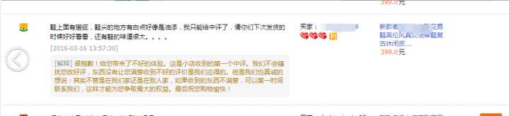 为什么?我一开始的心态可能就是题主问的那种,凭什么不能有中评呢?一个东西有人满意有人不满意,对吧?一批产品(我们是卖鞋子的,它不是标类产品,所以难免出现有瑕疵,因为价位决定了这个做工。我们不能保证做工完全没问题,但是对得起价位是肯定的,但是问题就出在:不一定所有人都认可你的做工代表的价位)。所以我完全可以接受中评,我还光明磊落的说:我们不会骚扰您,您以后有不满意的,也可以先联系卖家,不然是对双方都不好嘛