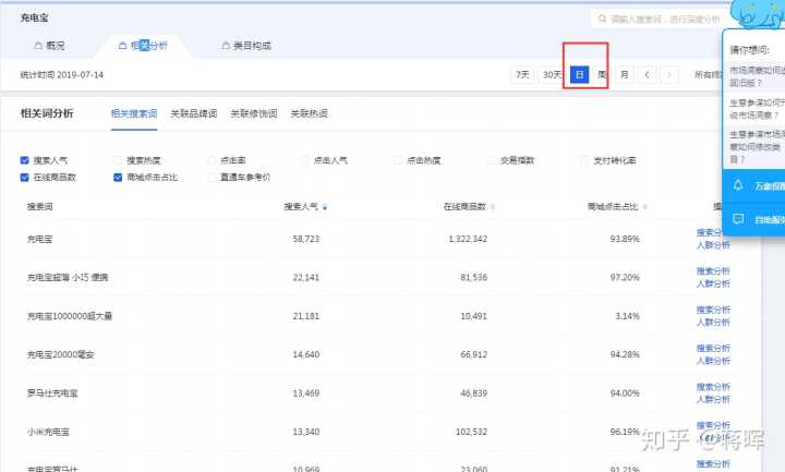 怎么判断一个市场竞争情况呢,一个神奇的公式:通过“生意参谋-市场-搜索分析”,输入“充电宝”,然后按照搜索排名,注意这里是一天的数据。(会更加精准)