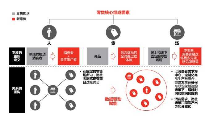 这里还要注意一点,重点应当把握两个词,消费者和数据,即依托大数据技术,使得零售商获得用户的精准画像,驱动“人”、“货”、“场”三者关系的重构。