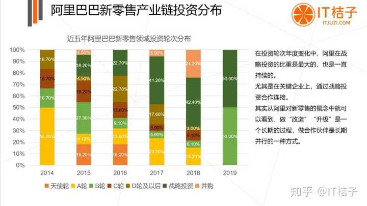 我们可以看到,在投资轮次年度变化中,阿里在战略投资的比重是最大的,也是一直持续的。尤其是在关键企业上,通过战略投资做一种合作连接。其实从阿里对新零售的概念中就可以看到,做「改造」「升级」是一个长期的过程,战投,做合作伙伴其实是比较好,长期并行的一种方式。