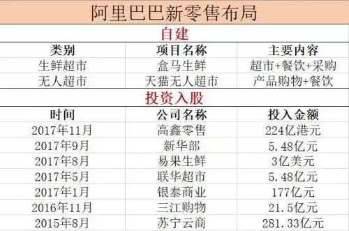 据媒体统计,“新零售”概念提出后短短一年时间里,阿里系围绕着新零售拼图,从投资标的的资金占比来看,对连锁超市及百货类企业的投资,涉及金额占比最大。在过去一年,入股三江购物、银泰商业、联华超市、新华都、东方股份等企业,据21世纪经济报道粗略统计,近4年间阿里至少在传统零售业砸下了750亿元。
