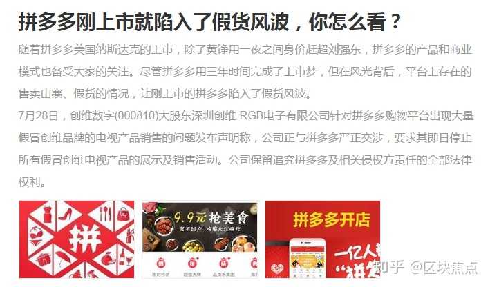 刷了几天热点消息,先是创维维权、童话大王投诉拼多多,后又有拼多多被工商部点名、黄峥召开媒体发布会提到的“山寨”问题等等这些都是在拼多多上市之后炒起来的,拼多多上市的确是导火索,其中必不可少的有眼红的人的“黑公关”存在,但主要还是消费者们积愤已久,终于还是爆发了出来,不管是不是在拼多多上买到假货导致消费权益受到侵害还是每天“快帮我砍一刀”这样的分享方式渗透生活带来的厌烦情绪,拼多多上市这样的热点是一个很恰当的宣泄点。