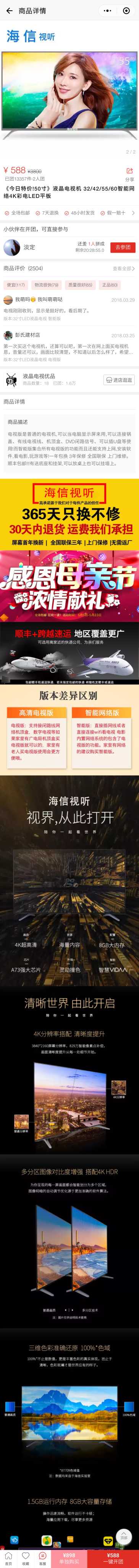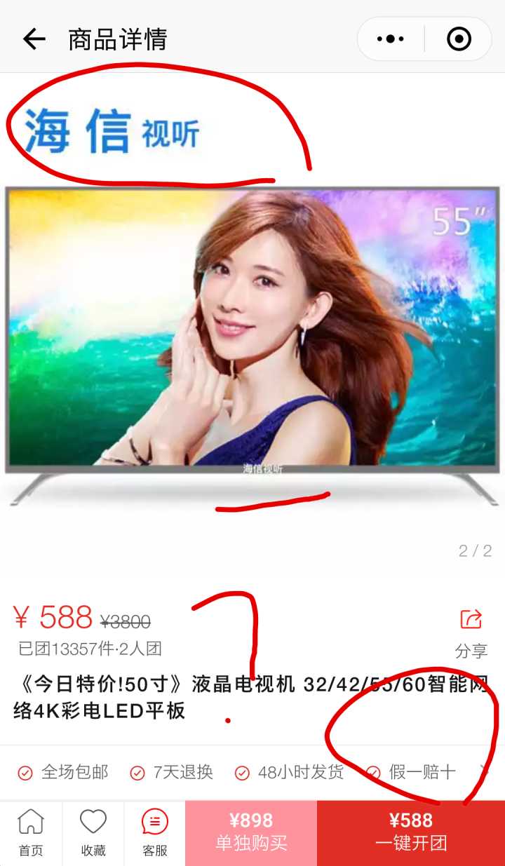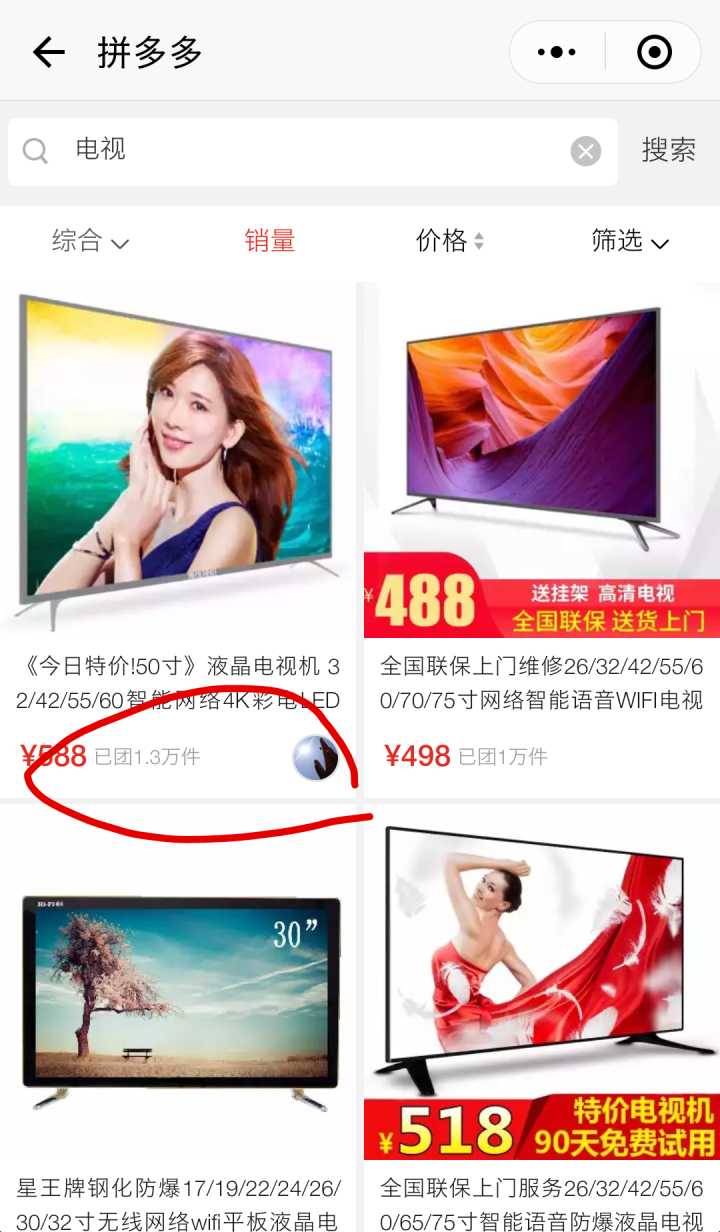 五一期间正好我在家,我爸晚上吃饭说要买个电视,我也没有太在意(以前爸妈都是在京东和淘宝买)。第二天得知他已经买完了,我问的买了什么,得知是在拼多多花1800买的海信电视,我一听不大对劲。本人也很少在拼多多买东西,很少超过三十块,这时我打开拼多多搜索了一下电视。