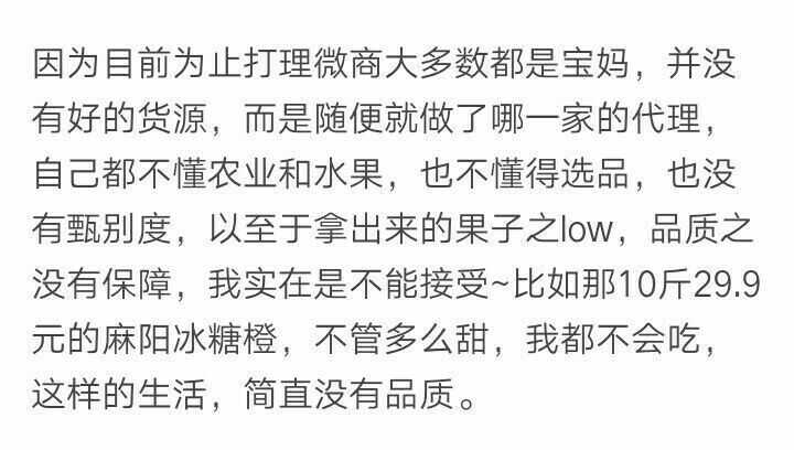 买水果可以通过微商也可以从淘宝或拼多多,但一定要是原产地,是果农家自己的微商或网店。。。因为自己家(盐源,泸沽湖那个地方)一直在种苹果,并且一直在微信端所以比较了解,很赞同之前看到的一个回答。如下图:
