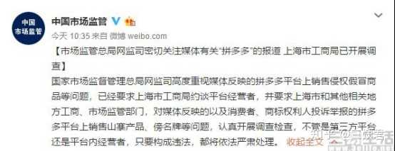 而拼多多遇到的还不仅仅来自舆论的压力,国家市场监督管理总局网监司点名要求拼多多,要求上海市和其他相关地方工商、市场监管部门对其平台上销售山寨产品、傍名牌等问题,认真开展调查检查。并表示“不管是第三方平台还是平台内经营者,只要构成违法,都将依法严肃处理”。