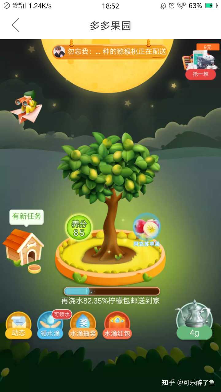 水滴的获得方法太多了,不列举了。总之,如果你想快速种出来,20包化肥,大概需要你拼单10~15次不等,4000滴水滴,则需要20次左右,这也意味着,想要快速种出一棵果树,你可能需要拼单30~40次左右我这颗树从种植到结果大概花了两周的时间,拼了35件商品……下一棵树可能30次就可以,如果慢一点花两三个月,20~25次也是可以的,但是拼那么多商品,花了成百上千的钱,但是收获只是15元包邮的三斤芒果,而且要花好几个小时的浇水时间,实在是……有点不划算,玩玩可以,但是真为了水果就不值当了。