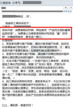 案例:某店主接到消费者向工商局投诉,网站宣传使用绝对性用语“最”(文案:产品符合国际最高品质标准)字样,涉嫌虚假宣传,要求退一赔三。
