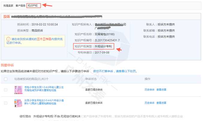 案例:某书包店铺因商品的外观设计被投诉知识产权侵权,商家可以查看到投诉方有相应的专利凭证(所有人、编号、专利类型等),同时也能网上查找到相应专利资质。这样的投诉举证难,除非自己的产品也申请了专利,能举证与投诉方存在不一致的地方,并且相应的举证证据在有效时效内。