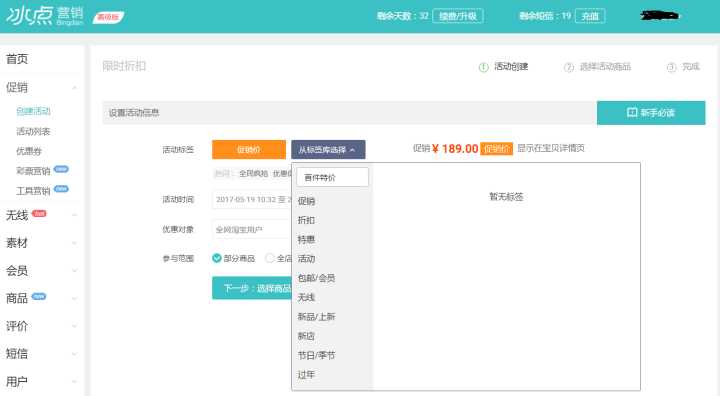 现在这种词现在用不了了。打折促销的标签词库已经被限制死了,大概只有150个,后面不知道淘宝官方给不给增加,我查了下,你上面说的那些,现在都已经用不了了。