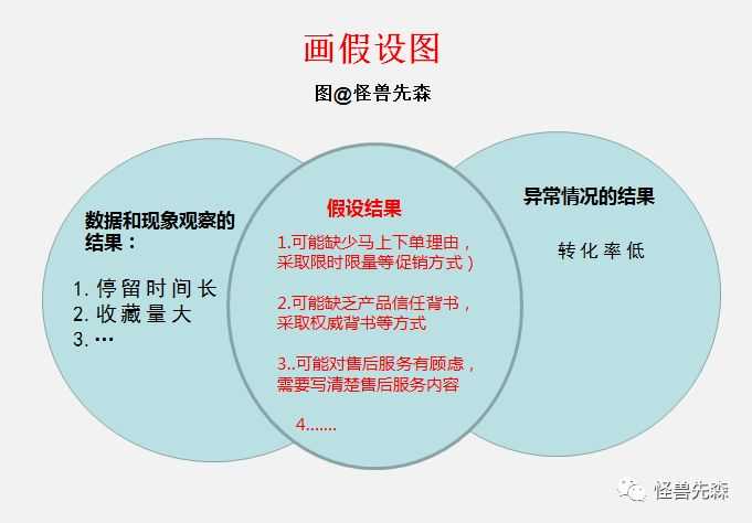 比如再说回文章开头例子,用户在你网店里停留时间长、收藏数大,但转化率却不成正比。然后列出来,进行假设。
