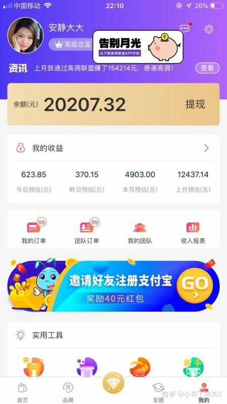 除了自己推广商品,还可以招代理。高佣联盟这个APP本身有代理功能,比如你把这个APP推广给朋友A并填上你的邀请码,那么A就是你的代理其在高佣联盟买东西你都有佣金,A也可以招代理,他招过来的代理消费你也有佣金,循环下去。用愚公移山的话说子子孙孙无穷匮也。