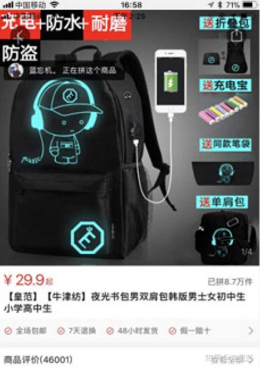 以这9万销量产品为例, 黄范 牛津纺 就是他的黄金促销词, 夜光书包是主词