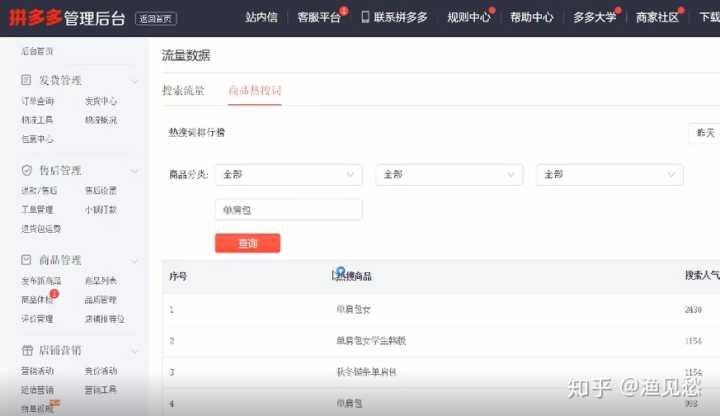 打开拼多多后台,查看商品热搜词,比如搜索“单肩包”,出来的热搜产品会以搜索人气排序,我们就可以采用搜索人气较高的“单肩包女”、“单肩包女学生韩版”等