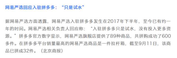 今天看到各大媒体都在报道网易严选入驻拼多多,官方回应:只是试水,没有投入更多资源???