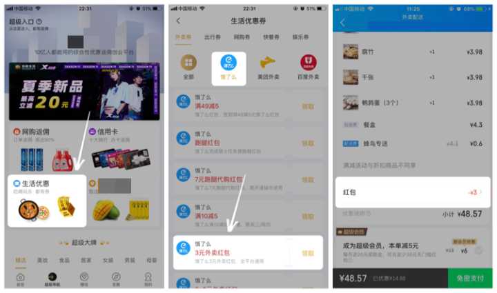 有大量的生活优惠券,涵盖你的衣食住行,对于这个月开始上晚班的人来说,每天晚上吃饭肯定是要点个外卖的,不然等到十点下班回去再做的话饿都饿晕了,好在这个app上面有外卖的优惠券,虽然我已经开了会员,但是一个月只有四个红包是完全不够的,好在这上面还有许多满减红包。