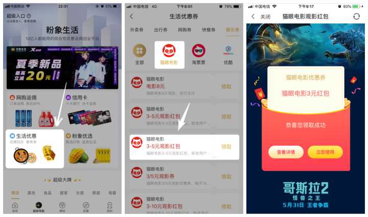 电商券只是其中一部分而已,京东、拼多多内部优惠券都是可以领取的,除了电商券,其实还可以领取各大生活类优惠券,例如美团、饿了吗、滴滴、摩拜哈罗、淘票票等等